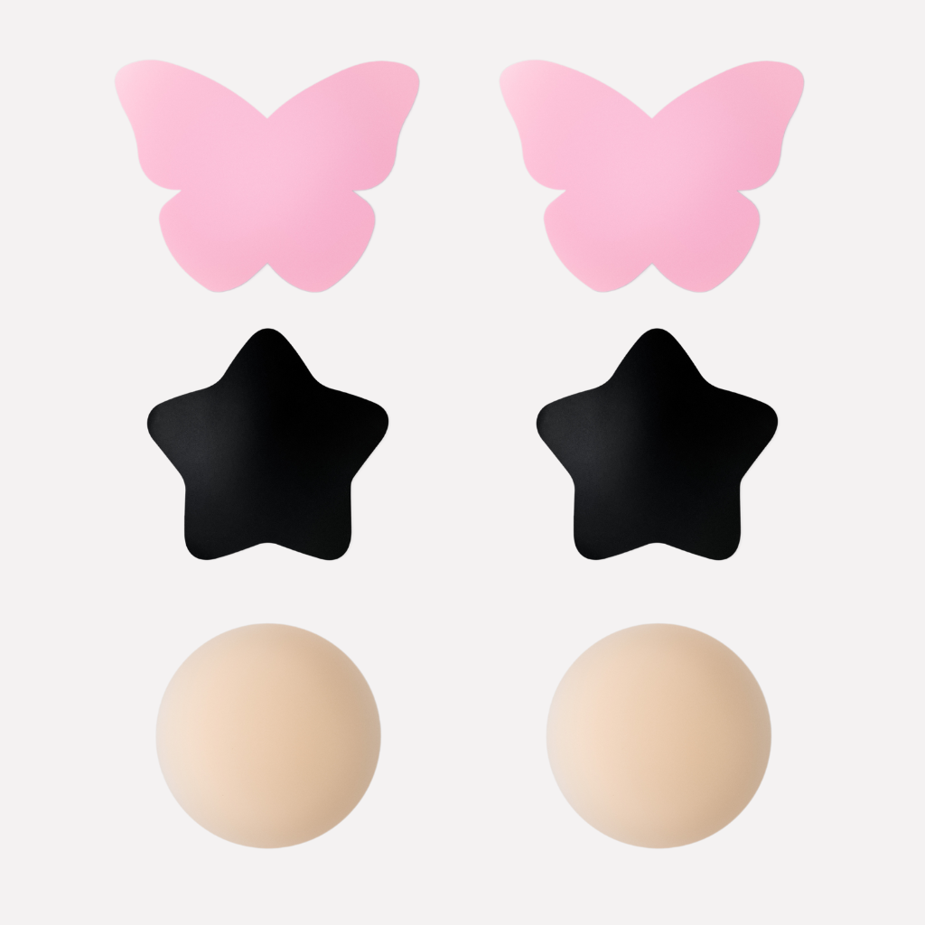 Bundle and Save! Bundle includes The Butterfly in Pink, The Star in Black and The Circle in your choice of Nude I or Nude II.  Self-adhesive, ultra-thin silicone patches made for smooth coverage and lie seamlessly under clothes.